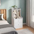 This minimalist-style bedside table features a warm white design, displaying a soft and comfortable texture. The upper section is designed with separated storage areas, including an open tray and two differently sized compartments, perfect for organizing various small items. The bottom section features two spacious drawers with natural wooden round knobs, simple yet warm. The elegant curved side design adds a soft touch, while the multi-functional compartment design makes this bedside table more practical, meeting diverse storage needs, making it an ideal choice for bedrooms and children's rooms.