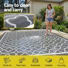 Upgrade your exterior living area with the Soren, a versatile 2-side outdoor rug featuring reversible stylish designs for an instant patio refresh. This large area mat is crafted from premium polypropylene plastic straws with a specialized uv coating and heat-treated edges, ensuring it resists fading, water, and wear while remaining soft underfoot. The lightweight yet durable construction makes it an ideal choice for decks, poolsides, camping, or the beach. This weather resistant rug is a breeze to clean as you can simply hose it down or wipe it with a cloth to remove dirt and debris. Featuring a non-slip grid backing for efficient drainage, this dual sided patio rug blends practicality with boho charm. It comes with a convenient carry bag for easy storage and portability, making it perfect for gardens, rvs, and endless outdoor adventures where you need a reliable and stylish ground cover.