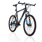 Experience the thrill of the trail with this high-performance 26 inch mountain bike. Engineered with an alloy special-shaped tubes frame measuring 17 inches, it's perfectly sized for riders between 165-178cm (approximately 5'5" to 5'10"). The bike features a responsive lock-out suspension fork with 100mm of travel, ready to absorb shocks on varied terrain, all finished in a striking matt black/blue color scheme.