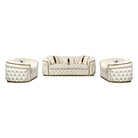 The set includes one 3-seater sofa and two single armchairs, all featuring plush and fluffy cushions crafted with high-density foam for superior comfort. A sturdy wooden frame promises years of reliable, long-lasting use. This velvet sofa set features beautiful ornamentation, finely decorated with deep quilting and upholstered buttons on the padded surface. Its unique half-moon shape and premium gold trim base make it a very exclusive collection for your living room. Detailed stitching is provided on the velvet upholstery to enhance the sofa cushions' overall resiliency and luxurious feel.