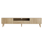 Style and functionality blend together in the beautiful Alex Entertainment Unit from Artiss. This lowline entertainment unit has the perfect height and storage capacity for all your entertainment needs, from your television to your sound system and consoles. The simple handle-less design and natural wood-grain finish will blend in perfectly with modern homes. Made from thick particleboard with a smooth melamine finish and solid rubberwood, the unit is sturdy and durable for long-lasting use. Two storage cabinets, one spacious drawer and an open shelf with cable management are perfect for your media, books, equipment and other trinkets. The solid rubberwood legs feature anti-slip feet to ensure the unit stays standing and prevents scratches to your floors. Easy to assemble and even easier to maintain, the Alex Entertainment Unit will keep your home theatre organised for years to come.