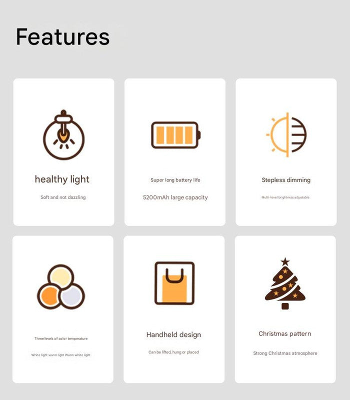 Create a warm and festive atmosphere with this elegant Portable Christmas LED Lantern. Designed with a beautiful holiday pattern, this lamp serves as both a functional light source and a charming decorative piece. It features healthy, soft, and non-glaring light, perfect for any room. Customize your ambiance with three adjustable color temperatures (warm, white, neutral) and stepless dimming to achieve the perfect brightness for any occasion. The light also has a memory function, retaining your last setting when turned back on. With an extra-long battery life from its large 5200mAh capacity and a convenient Type-C charging port, this lantern is built for endurance. Its comfortable handheld design allows you to carry it anywhere, making it ideal for adding a festive touch to your home, patio, or holiday gatherings.